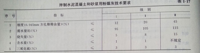 (1)拌制水泥混凝土和砂漿時,作拌和料的粉煤灰成品應滿足表1—17的要求。