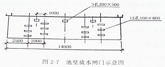 進灰水渠道斷面為50cm×70cm,總長200m。池壁放水閘門(圖2-7)由標高0.3m開始,每隔0.2m設兩個0.1m×0.8m的排水孔,及標高0.5m、0.7m、0.9m、1.1m和1.3m處各設兩個。標高1.5m處設三個0.2m×0.5m的排水孔。排水管道190m,井點抽水設備兩套。
