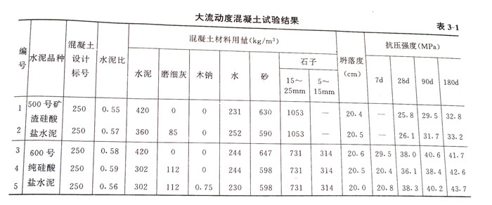 在大體積混凝土中,使用普通硅酸鹽水泥,由于水泥水化時硅酸三鈣(C3S)和鋁酸三鈣(C3A)作用發(fā)生熱量,Ig硅酸鹽水泥的總放熱量可達502J,因而導(dǎo)致混凝土溫度升高以至溫差收縮引起的裂縫。在普通混凝土中摻入粉煤灰后,水化熱明顯降低。表3—4是混凝土溫升狀況。由表列數(shù)據(jù)可知,摻30%粉煤灰與不摻粉煤灰的混凝土相比,絕熱溫升低27%~33%,較高溫升降低30%,并且可以減少或完全不需要人工冷卻措施。