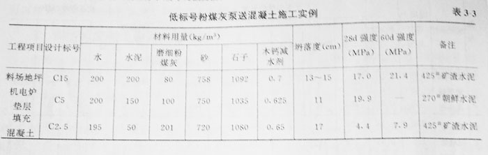 可泵性主要決定于混凝土與管壁之間的摩擦力。由于低標號混凝土的水泥用量少,可泵性差,因此,過去規(guī)定C15以下的混凝土不得泵送。可是摻如粉煤灰和減水機劑后,可使混凝土在不增加水泥的情況下仍能獲得良好的可泵性。在寶電工程中,C2.5、C5和C15的混凝土在300m水平硬管輸送時也沒有發(fā)生堵塞現(xiàn)在。表3—3是低標號粉煤灰泵送混凝土的施工實例。